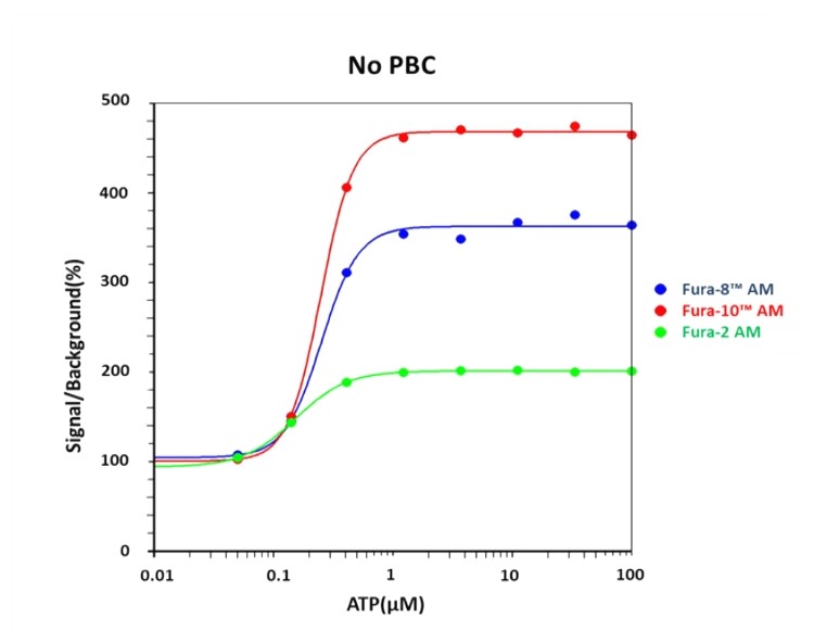 Image: ATP-stimulated calcium response of endogenous P2Y receptor in CHO-K1 cells measured with Fura-2 AM, Fura-8™ AM and Fura-10™ AM in the absence of Probenecid: CHO-K1 cells were seeded overnight, then Fura-2 AM or Fura-8™ AM or Fura-10™ AM without probenecid was added into the cells, and ATP was added to achieve the final indicated concentrations. |