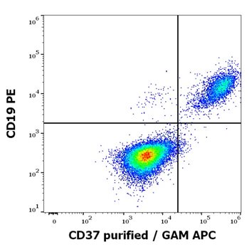 | MB-1 is a mouse monoclonal antibody, which recognizes an extracellular epitope of CD37, and is suitable for flow cytometry, immunoprecipitation, and immunohistochemistry. CD37 is a 40-64 kDa tetraspanin family glycoprotein, which forms complexes in the B cell membrane with MHC class II, CD53, CD81, and CD82. It is expressed highly on mature B cells and neoplastic B cells, but it is lost on plasma cells, as well as on pro-B cells. Lower expression was detected on monocytes, macrophages, and dendritic cells. Fig. 1: Flow cytometry multicolor surface staining of human lymphocytes stained using anti-human CD37 (MB-1) purified antibody (concentration in sample 0.2 μg/ml, GAM APC) and anti-human CD19 (LT19) PE antibody (20 μl reagent / 100 μl of peripheral whole blood). Currently available formats: Purified 11-923-C100 Coming soon: PE 1P-923-T100 |